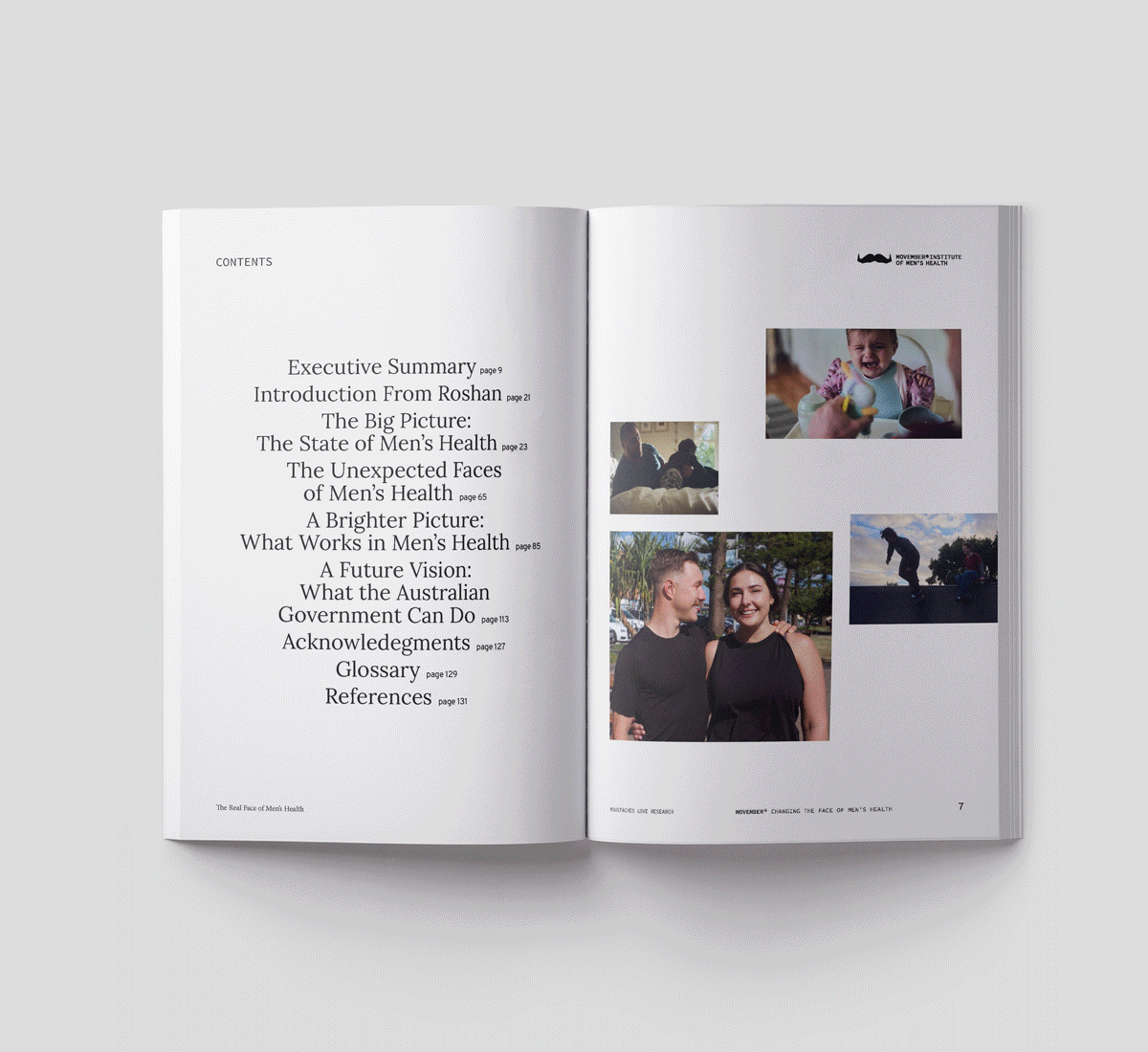 To share the findings of the state of men’s ill health, carers and government support systems, Movember created a series of Mental Helath Reports to be sent to the governments of each country. Below is the Australian Report, designed based off the English Report. This report was shared to press and delivered directly to government officials, with the aim to get more commitment and support from health departments to make up underfunding for year. The report used The Real Face of Men’s Health campaign assets, alongside developing a new visual design style for the Movember brand.